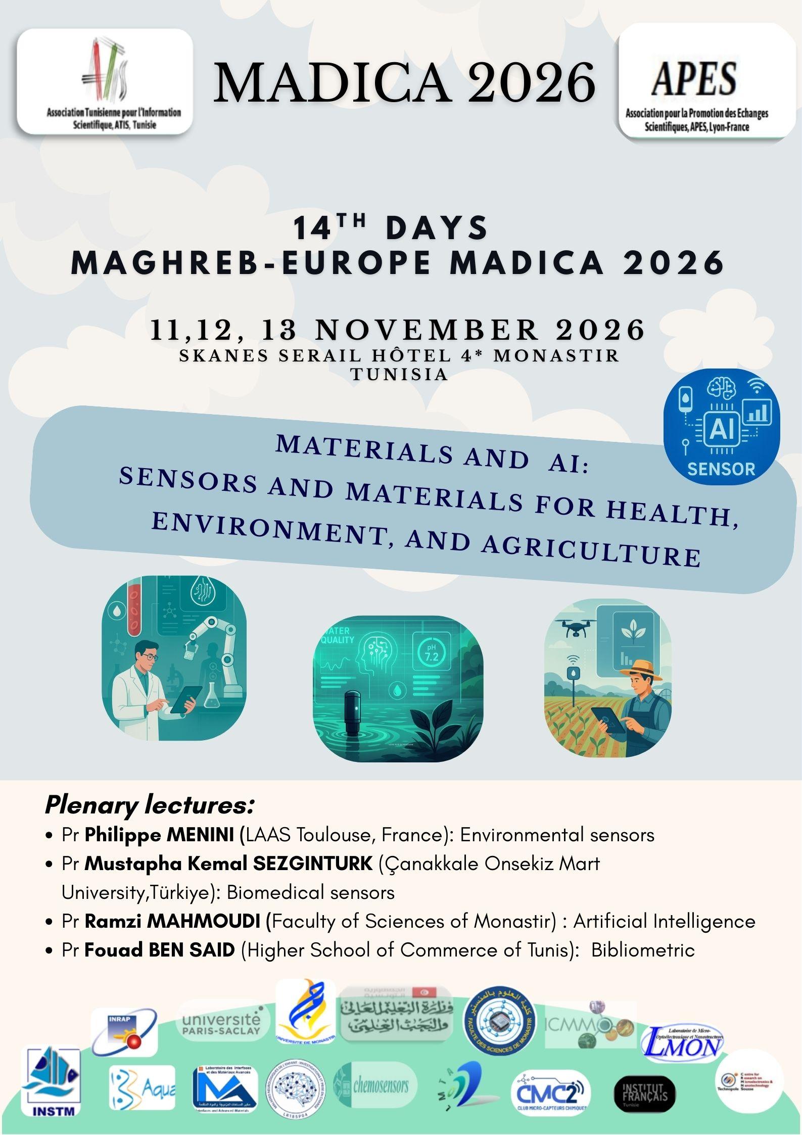 As part of our activities in collaboration with the Association for the Promotion of Scientific Exchanges (APES, Lyon1-FR), we are organizing the 12th version of the Maghreb-Europe days on "Materials and Applications to Devices and Sensors" (MADICA 2022) which will be held on November 9, 10 and 11, 2022 in Monastir.